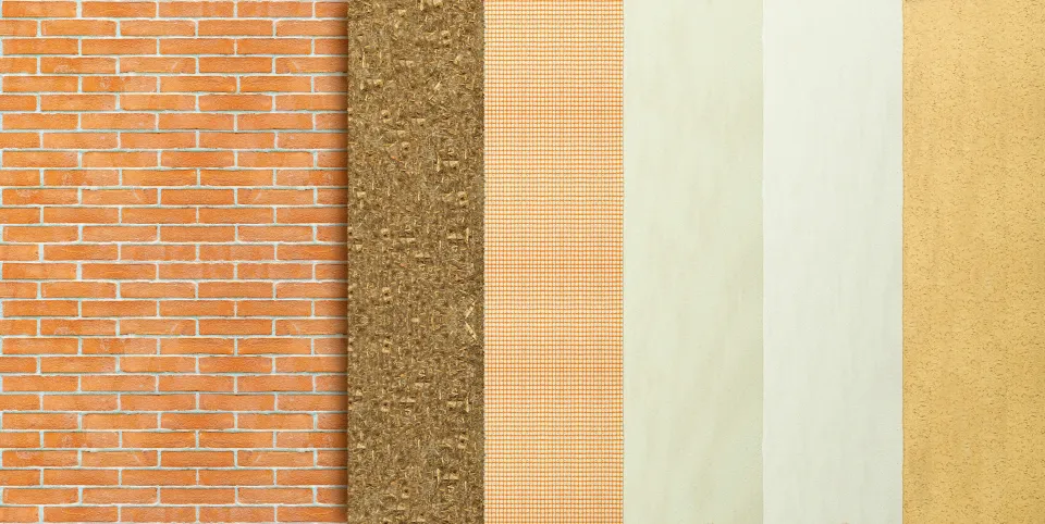 Dispositif complet associant isolant, sous-enduit armé et finition décorative pour une enveloppe thermique performante et esthétique.